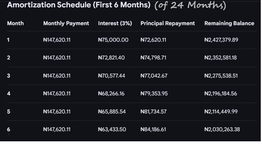 For a ₦2,500,000 loan, you will pay ₦525,000 upfront (equity + fee) and then ₦147,620.11 monthly for 24 months.